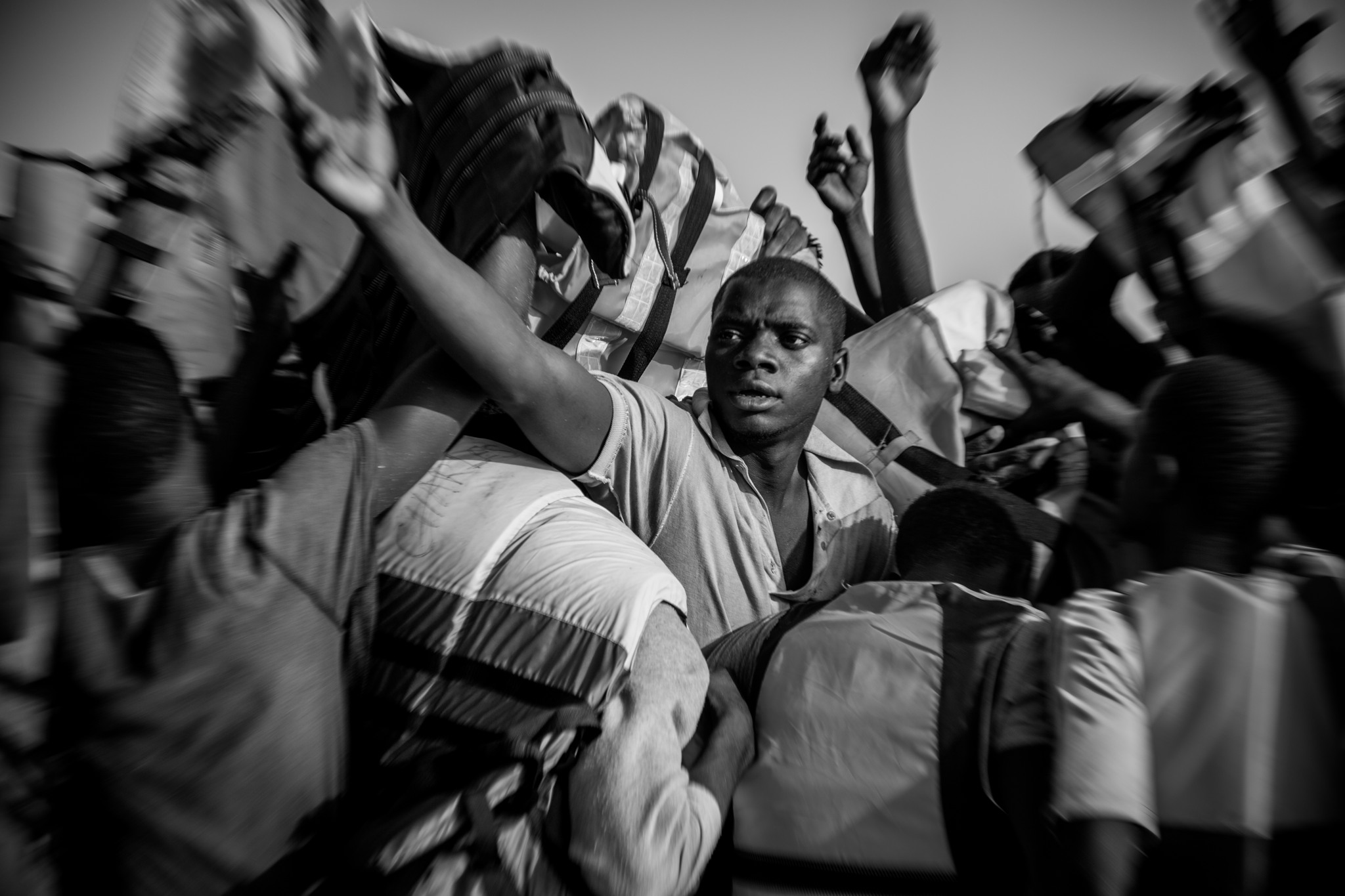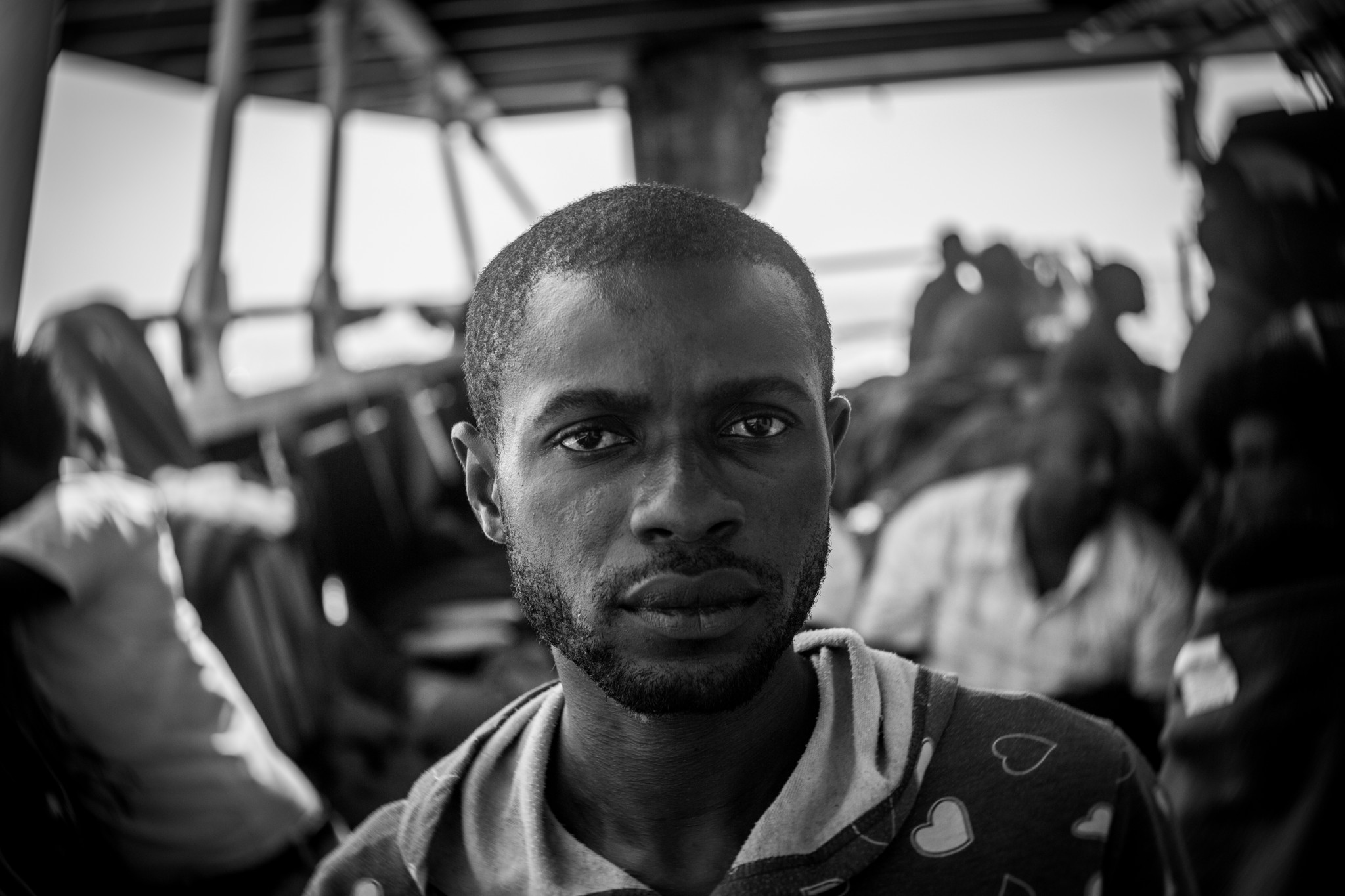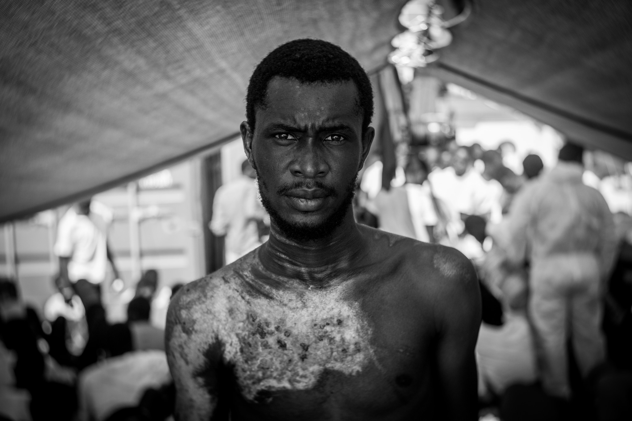 Samson Lawrence, 24, aus Nigeria: „Ich wurde von Boko Haram angezündet. Sie bekämpfen uns Christen. Ich will nach Europa, weil es in Nigeria keine richtige Behandlung für meine Wunden gibt. Auf dem Meer im Gummiboot stieg das Wasser immer höher, alle waren in Panik. Noch eine Stunde und wir wären ertrunken.“