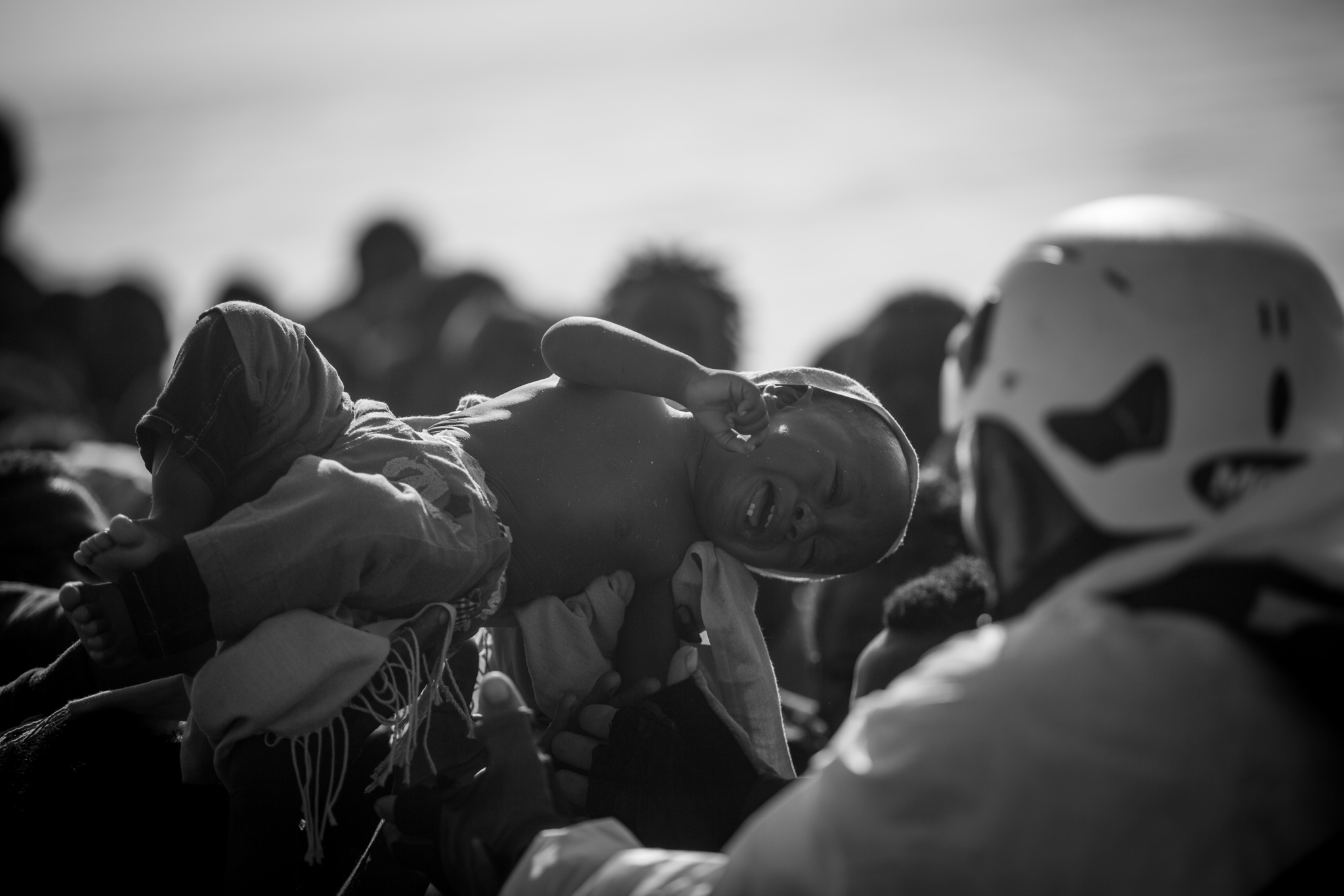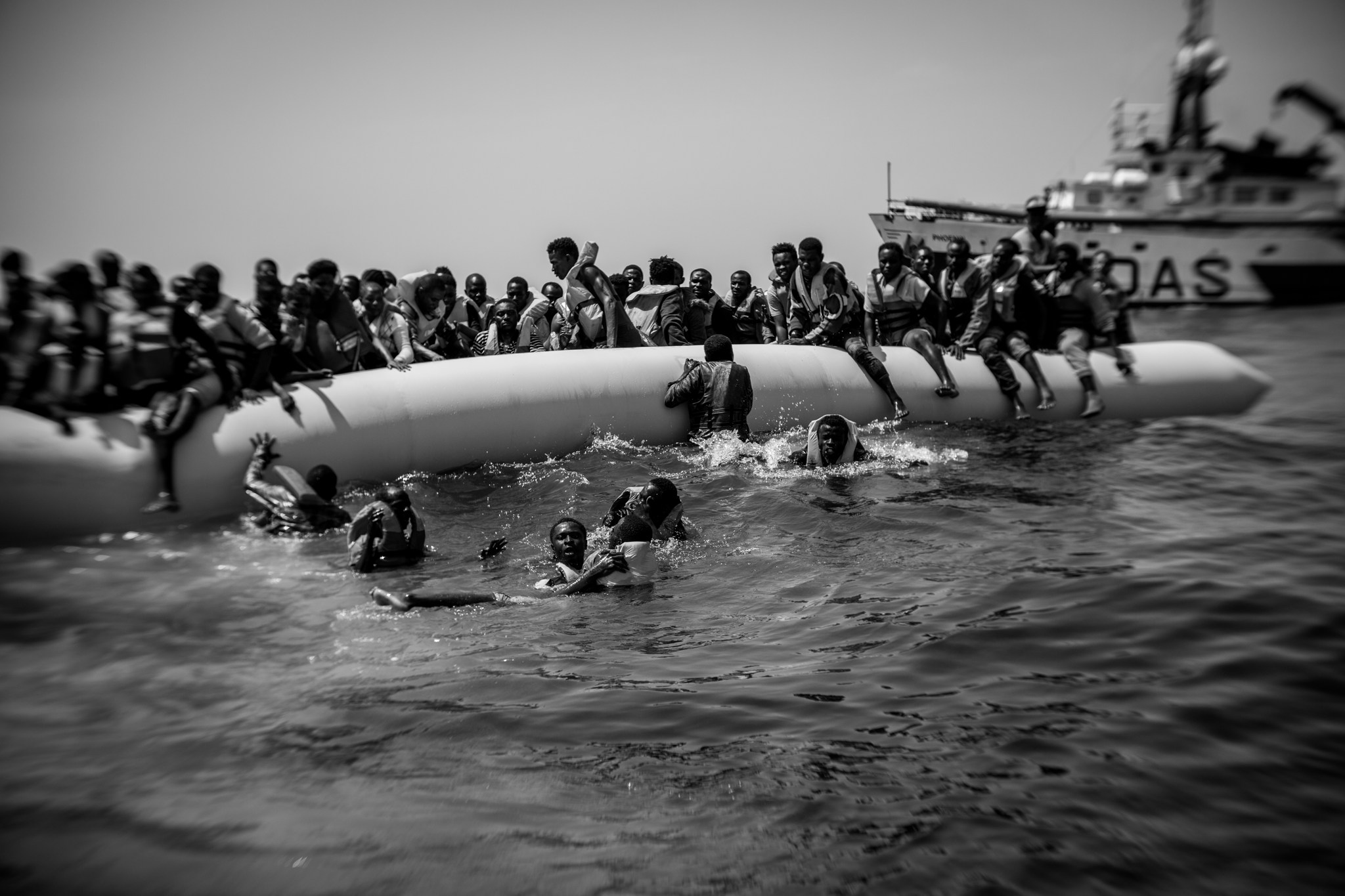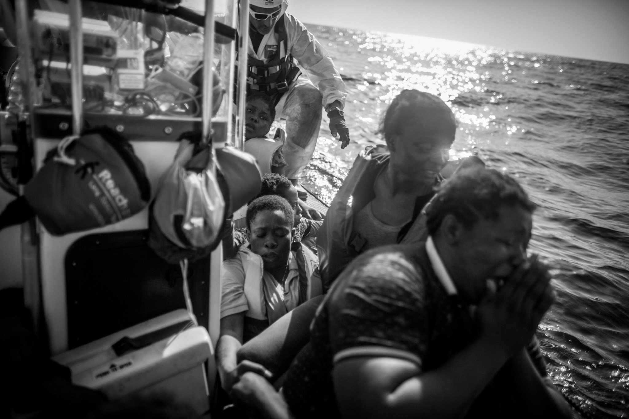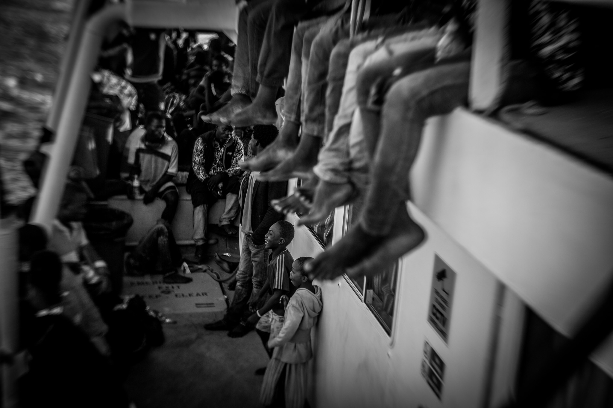 Wasser. Zuerst gibt es Wasser für alle. Dann Essen. Und dann, spätestens nach einer Stunde, schlafen alle Flüchtlinge, die wir retten konnten. Bei einigen habe ich das Gefühl, der Druck von Monaten und Jahren der Flucht fällt von ihnen ab.